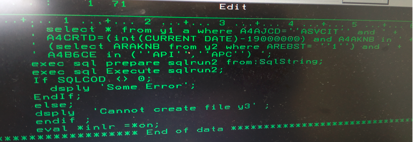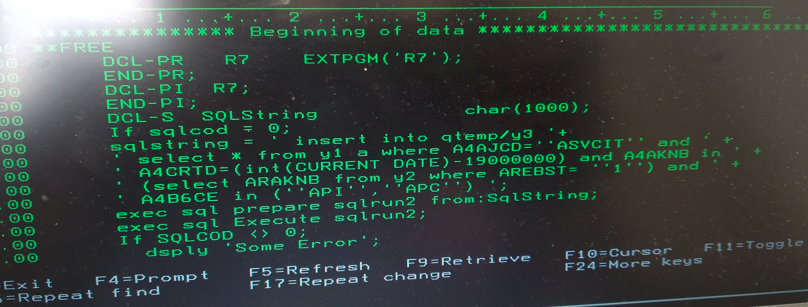 so I tried to write this SQLRPGLE program ( in which some fields and files name are different but main logic to cover above SQL query criteria is same.) (attached snapshot of program and error when tried to call it)